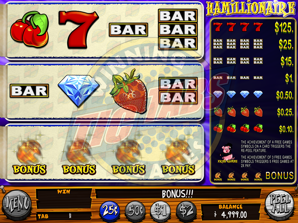 3 Window Finite Pull Tab Game with Bonus re-peel feature.